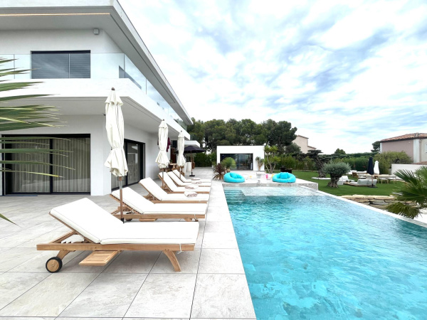 Située dans un secteur calme et privilégié, à deux pas du centre-ville et de la mer, cette somptueuse maison d’architecte contemporaine allie modernité, confort et luminosité. D’une surface habitable de 400 m², elle s’ouvre sur un grand salon et salle à manger, prolongés par une cuisine américaine entièrement meublée et équipée, le tout donnant sur une spacieuse terrasse offrant une vue imprenable sur la mer. La maison dispose de quatre chambres en suite avec dressing et salle de bains privative, dont une chambre en rez-de-chaussée idéale pour plus de confort et d’accessibilité. Les chambres à l’étage bénéficient chacune d’une terrasse avec vue mer, créant un véritable espace de détente et de contemplation. L’extérieur est un véritable écrin de verdure : grand jardin arboré et décoré avec des meubles design, terrasse avec piscine à débordement, pool house et espaces de réception pour profiter pleinement du climat méditerranéen. Un garage en sous-sol et une cave à vin complètent ce bien d’exception, alliant praticité et luxe. Cette propriété représente une opportunité rare sur le marché, offrant un cadre de vie d’exception alliant confort moderne, élégance architecturale et proximité avec la mer.