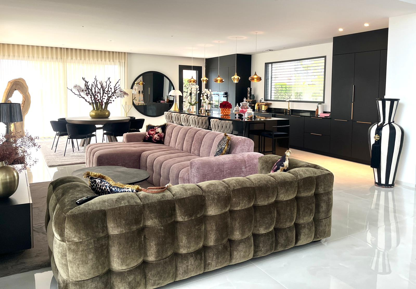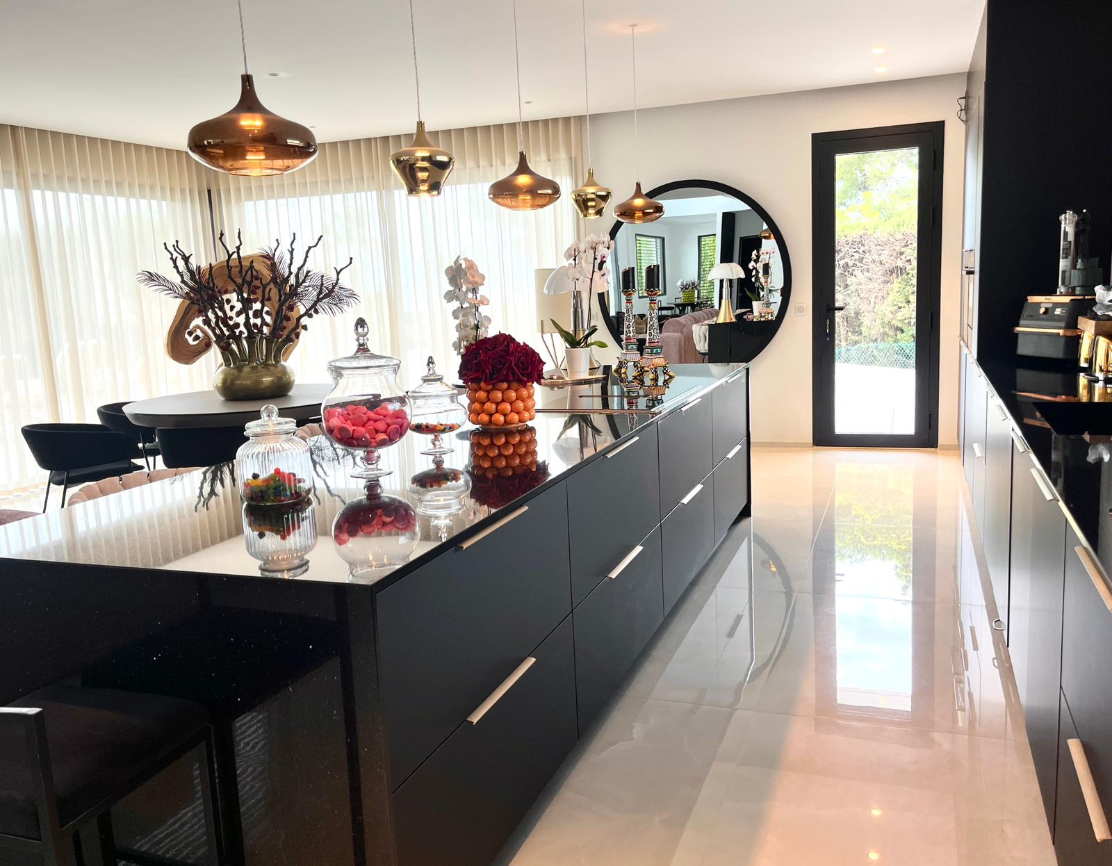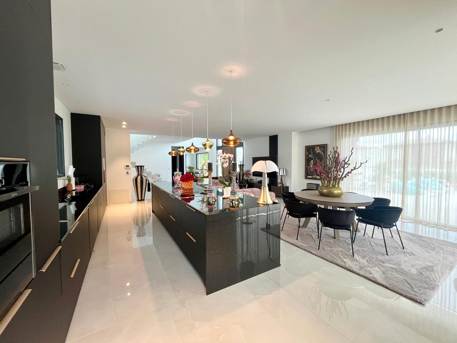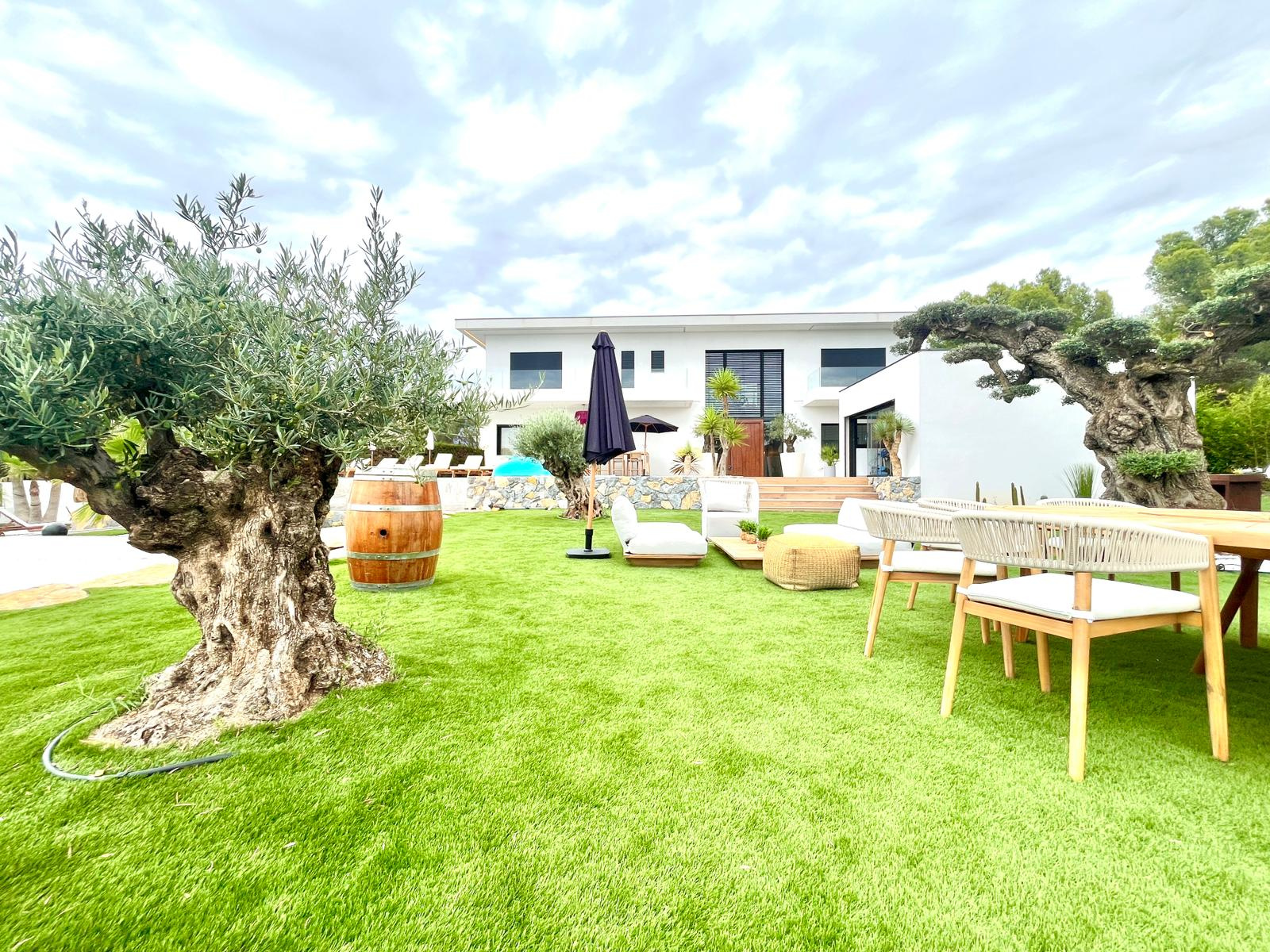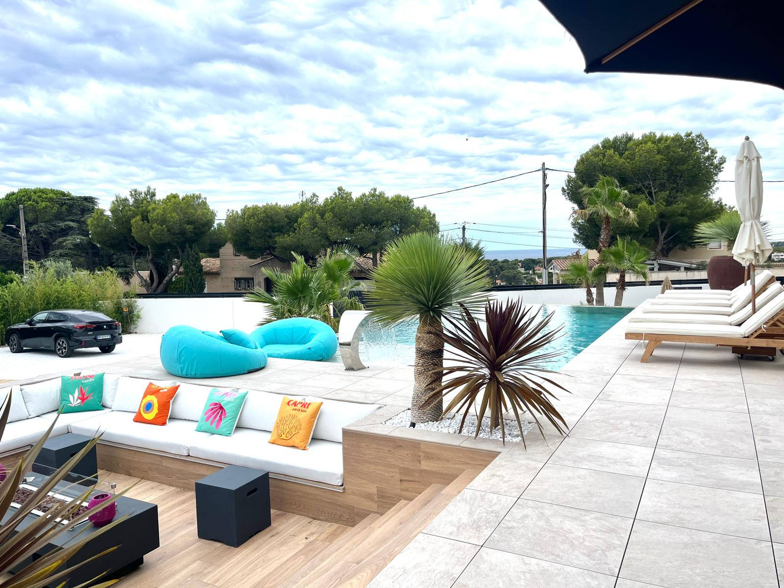 L’extérieur est un véritable écrin de verdure : grand jardin arboré et décoré avec des meubles design, terrasse avec piscine à débordement, pool house et espaces de réception pour profiter pleinement du climat méditerranéen.