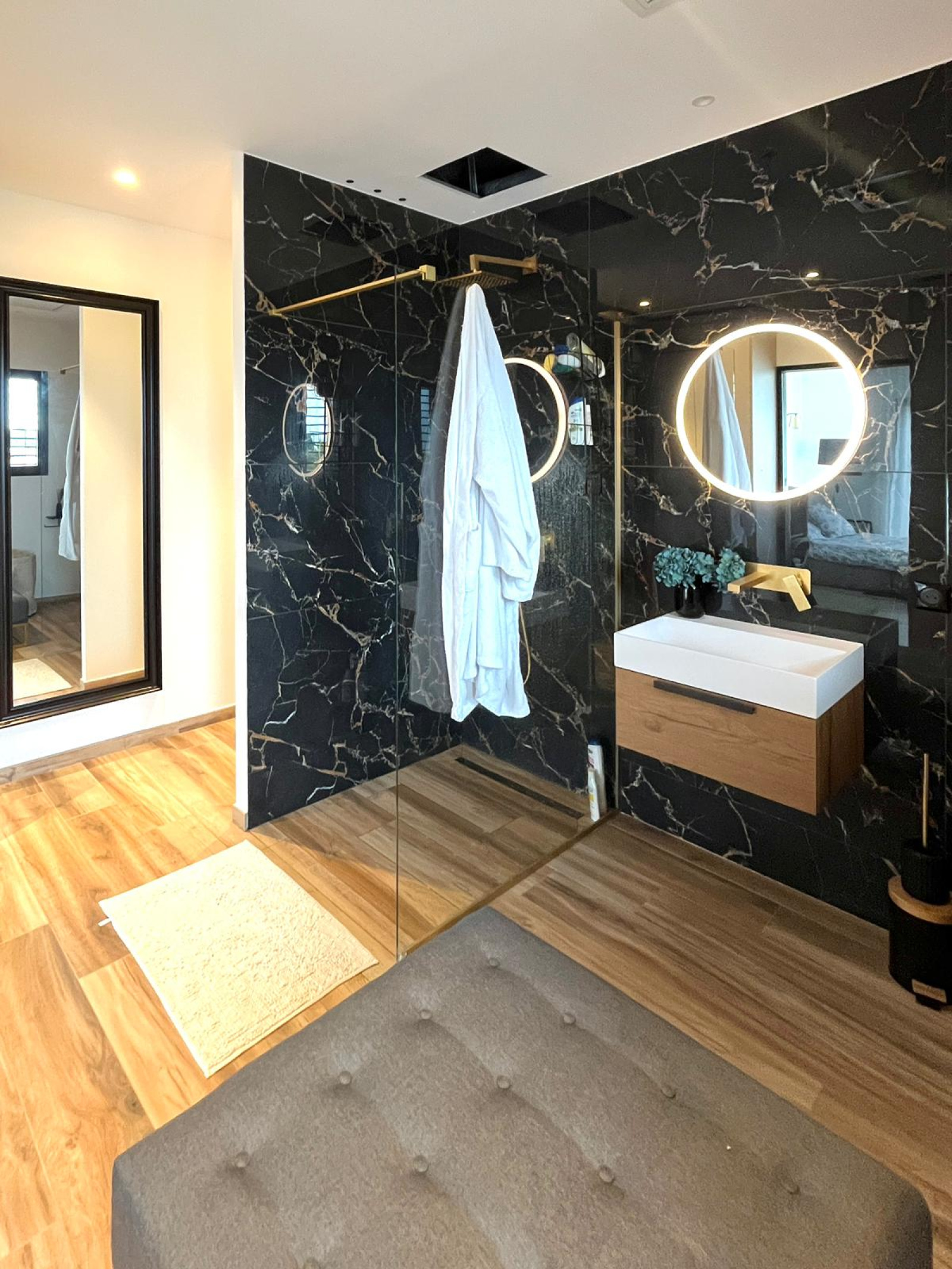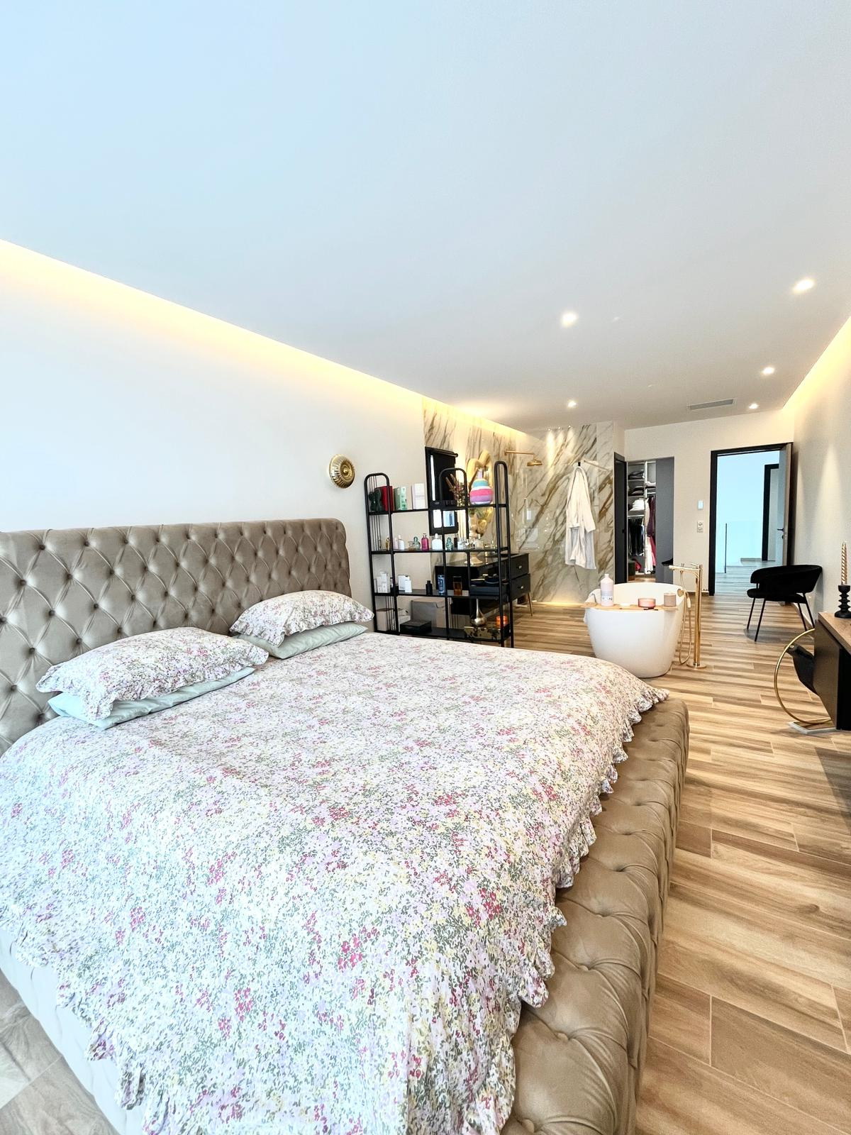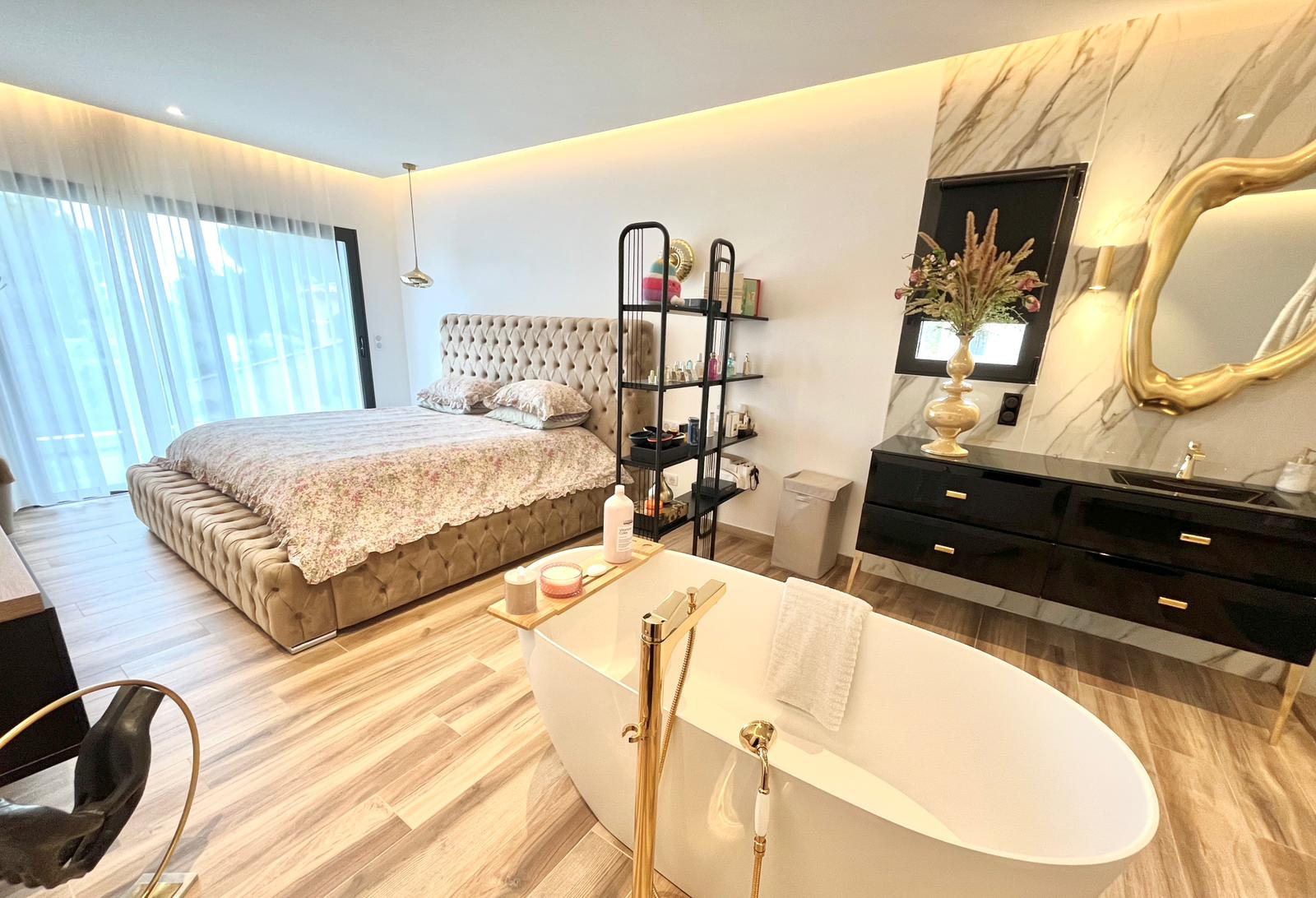 La maison dispose de quatre chambres en suite avec dressing et salle de bains privative, dont une chambre en rez-de-chaussée idéale pour plus de confort et d’accessibilité. Les chambres à l’étage bénéficient chacune d’une terrasse avec vue mer, créant un véritable espace de détente et de contemplation.